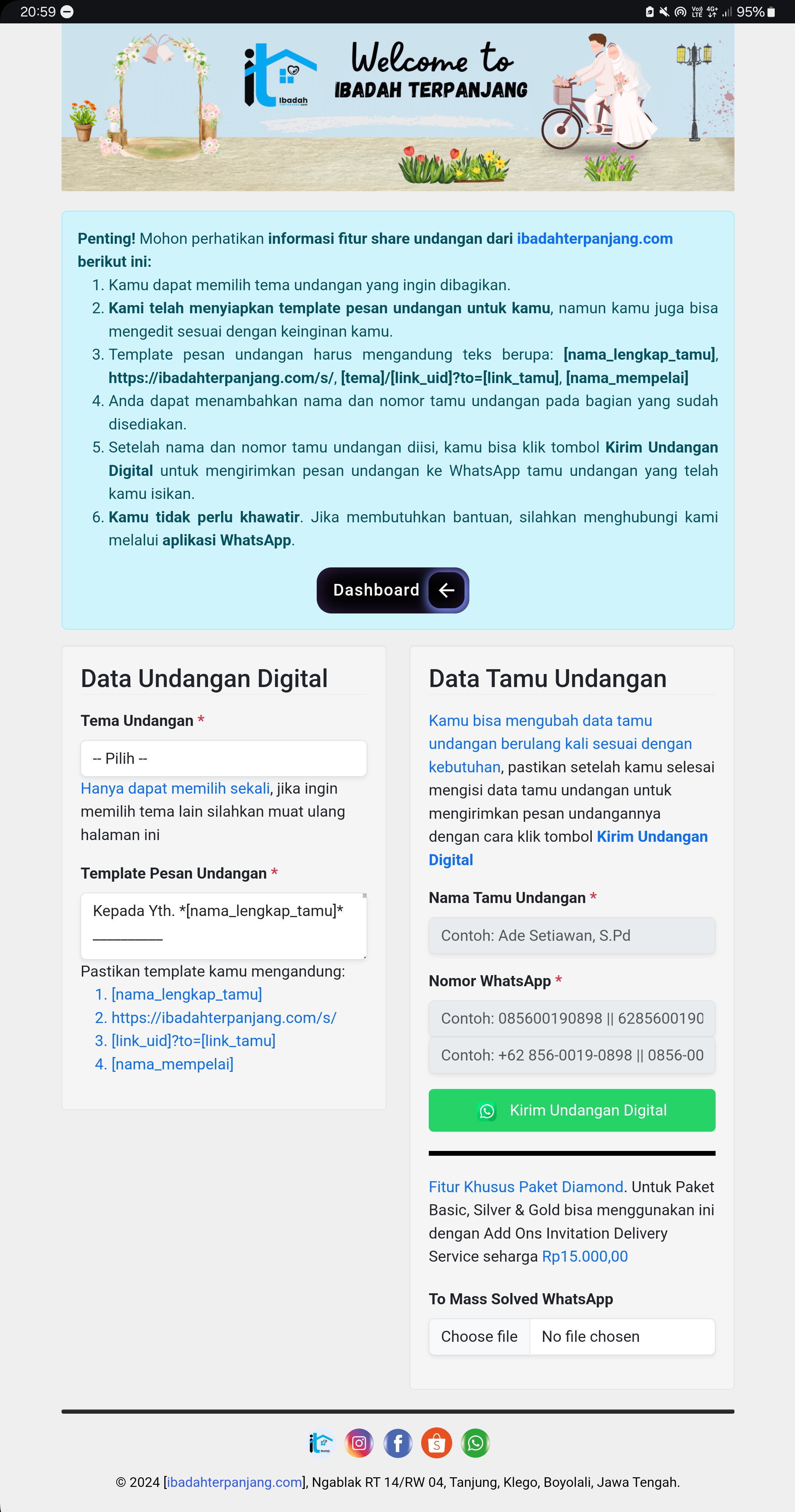 Kami menyediakan fitur eksklusif yang hanya ada di ibadahterpanjang.com, fitur ini akan mempermudahkan pelanggan dalam mengirimkan undangan pernikahan via WhatsApp